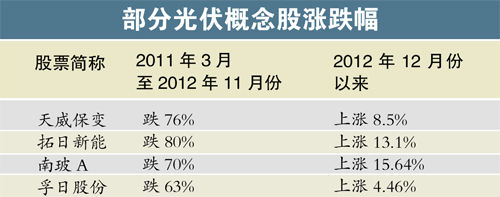 2011年开始,光伏企业迎来最新一波重创。2011年3月至2012年11月份期间,天威保变从24元跌至5.76元,跌幅高达76%,拓日新能跌幅达80%,南玻A 跌幅达到70%,孚日股份跌幅达63%。绝大多数光伏企业的股价降幅是同期上证沪指降幅(32%)的两倍至三倍。