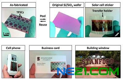 为了将太阳能电池从薄片上剥离,薄片必须在室温下放置于水里,热敏释放胶带会慢慢脱离,让水渗入镍和二氧化硅界面,太阳能电池就会慢慢地脱离硬片,但仍附在热敏释放胶带上。郑表示,这个实验已经表明即剥即贴过程不会影响太阳能电池的功效。“而且不浪费,硅薄片不仅不会遭到损坏,而且还很干净,太阳能电池剥离后,它可以反复被使用。现在你可以将太阳能电池黏在头盔、手机、凸面窗户、可携带电子设备、衣服等任何东西的表面。”