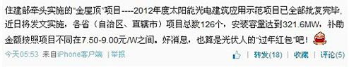 索比光伏网讯:今日早间,某资深光伏从业者在其微博上称,住建部牵头实施的“金屋顶”项目----2012年度太阳能光电建筑应用示范项目已全部批复完毕,近日将发文实施。这一利好消息,可算是对光伏人最好的奖赏,明年国内的光伏市场大有可为!