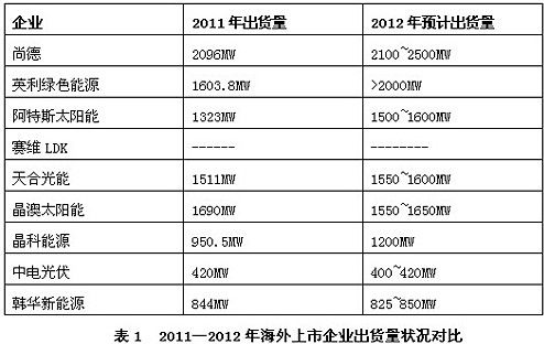 产能不能迅速淘汰,装机容量迅速上升也不能改变行业现状,也就无法结束厮杀激烈的价格战。纵观2012年各大光伏企业的出货量,其数值超过2011年的总出货量(详见下表1),因此企业面临的问题不是销量不畅通,而是产品售价太低,生产的越多就亏损的越多,在这样的背景下提升光伏电站的装机量又有何意义呢?