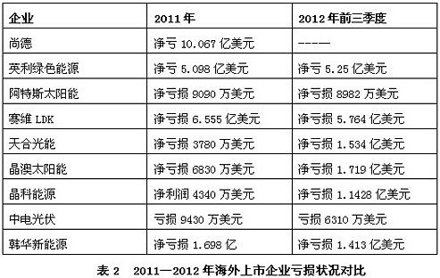 从表1可知,海外上市光伏企业今年的出货量普遍会超过去年,这也从侧面反映出光伏市场还是在向前发展的,不是市场出了问题,是光伏企业过度竞争造成了今天的困境。光伏产业是一个相对高端的产业,但光伏产业现在的竞争模式非常类似于小商小贩们所采用的伎俩,即低价逼走竞争对手,从而让对手退出行业,等到生产厂商数量减少,产量与产能相对对等之时再提高售价。遗憾的是,厂家数量太多,产能太大,有这种想法的人也太多,于是乎“价格战”一发不可收拾,企业亏损程度和资产负债情况超出想象,2011年和2012年海外光伏企业亏损程度对比见表2。
