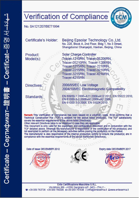 索比光伏网讯: 近日,北京汇能精电有限公司获得意大利ECM认证ENTE CERTIFICAZIONE MACCHINE(公告号1282)颁发的CE认证证书,认证产品覆盖MPPT控制器Tracer系列、EC、LS、VS等系列产品,性能符合欧盟低电压指令(LVD Directive 73/23/EEC)。近年来,北京汇能精电国际贸易业务保持成倍增长,欧盟市场需求强劲,潜力巨大。CE标志的获得使汇能取得了顺利进入欧盟及欧盟自由贸易协会国家市场的通行证,为欧洲市场的开拓奠定了基础。