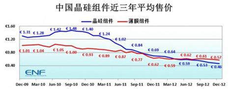 2011年12月国内生产商售出晶硅组件的均价为€0.68/瓦(¥5.84),至2012年同期,该价格已跌至€0.46/瓦(¥3.72)