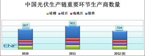 2012年间,光伏行业生产链的重要环节拥有生产商数从901家锐减至704家。