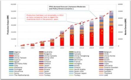 SEMI中国产业咨询团队经过广泛和踏实的数据收集、整理,在2013年初发布了全球光伏制造数据库,涵盖2004年以来的多晶硅、硅锭、硅片、电池片和组件厂的产能和产量数据1400余条。为光伏产业的参与者提供了全面、准确的数据信息,深入的历史、现状分析和有启发性的趋势预测。SEMI中国预计,2013年全球光伏组件的产能比2012年下滑13%,但产量会从39GW微升到43GW。这意味着2013年的供给比可预期的装机容量35GW仍然高出20%,组件价格必定延续下跌的趋势,光伏制造企业将继续以降低制造成本、提升组件转换率为主要努力方向。
