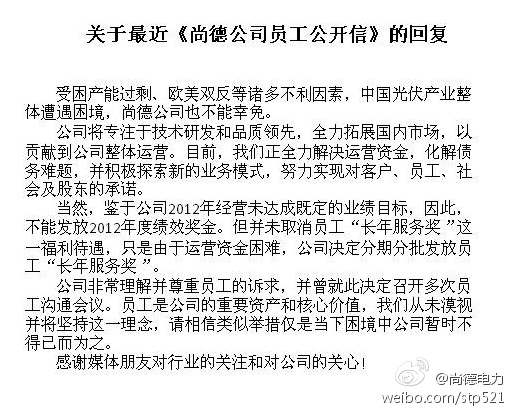 今日,尚德电力在官方微博发布了对《尚德公司员工公开信》的回复,称鉴于公司2012年经营未达既定业绩目标,因此不能发放2012年年度绩效奖金。