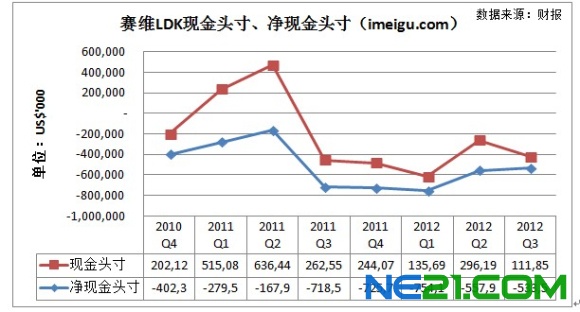 赛维LDK的现金持有量在度过其销售高峰后持续走低,净现金头寸也在2011年第三季度跌至负七亿美元,2012年一季度跌至历史最低点,近七亿六千万美元。之后二三季度净现金头寸有所改善。