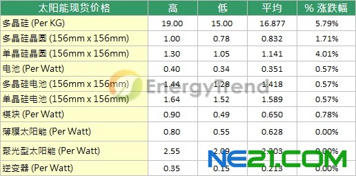 美金报价方面,目前多晶硅最低价上调至$15USD/kg,平均价格来到$16.887USD/kg,与上星期相比大幅调涨5.79%,我们认为是市场未来发展让买方对于价格出现妥协;硅晶圆方面,目前多晶硅晶圆最低报价上涨到$0.78USD/piece,平均价格则小涨至$0.832USD/piece,涨幅1.71%;单晶硅晶圆方面,受到日本市场积极拉货的影响,产品报价明显上扬,目前平均价格来到$1.141USD/piece,涨幅4.01%。电池报价方面,部分业者开始微幅上调报价,且获得不错的成果,使得平均价格微幅上涨到$0.351USD/Watt,涨幅为0.57%,模块方面也同步调涨报价,目前平均价格来到$0.65USD/Watt,涨幅为0.78%。