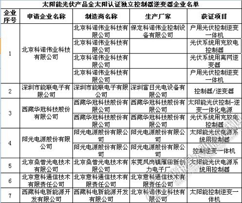 索比光伏网讯:“金太阳”每年都有很多企业通过认证,笔者在“金太阳”行业多年,汇总了截止2013年1月17日通过鉴衡和中国质量认证中心的通过“金太阳”认证的企业名录,供业内同事在招标、企业选择时使用。下面是太阳能光伏" title="光伏新闻专题">光伏产品“金太阳”CGC认证独立控制器逆变器企业名单。