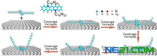 图1:STM图像。从单分子尺度揭示了QA分子随覆盖度增加形成的不同构型的分子膜。