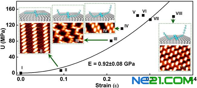 该研究的科学发现还包括:(1)QA分子的侧链在生长过程中具有双重功能。在低覆盖度的两种结构中,侧链具有调节分子膜中线形结构之间距离;在高覆盖度下,分子侧链部分上翘并加强了分子间的耦合(图2)。(2)跟平均到每个分子的能量变化相比,单位面积的能量变化可更准确地理解实验观测到的现象。(3)特别重要的是,所有的分子膜构型适用于单一杨氏模量,其幅值受侧链长度影响(图3),表明通过调节侧链长度,不仅能调控分子薄膜的物理和化学性质,还能调节其弹性性能。研究表明,利用烷基侧链可控制分子膜的结构,实现对有机分子薄膜的弹性性能的调制,这对未来柔性分子器件的发展具有重要的参考价值。