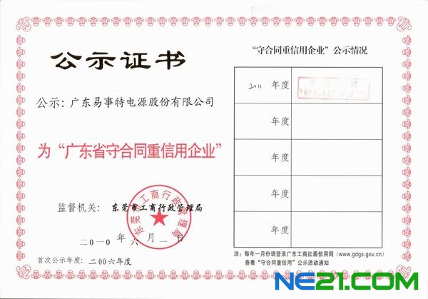 证书据了解,此项评选是东莞市为推动企业信用体系建设,树立守法履约企业的良好形象,培育良好的社会信用环境而开展的活动。经企业自愿申报,有关行业部门审查推荐,最后由东莞市工商行政管理局审查、认定获奖企业,并予以公示。易事特自成立以来,始终坚持“国家、荣誉、诚信、创新”的企业宗旨和“客户第一、品质第一、团队第一、结果第一”的经理理念,树立起公司“谨守合同、信守承诺”良好的品牌形象。
