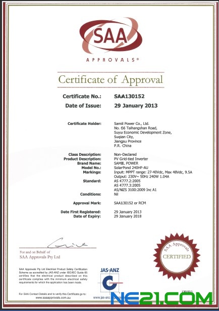 来源:世纪新能源网发布时间:2013-01-31 23:59:59 索比光伏网讯:世纪新能源网:近日,山亿新能源股份有限公司(以下简称“山亿新能源”)在2012新推出的微型逆变器SolarPond 240HF-AU,不久前顺利通过国际权威检测机构测试,获得澳大利亚SAA认证证书,顺利取得进入澳大利亚市场的通行证。
