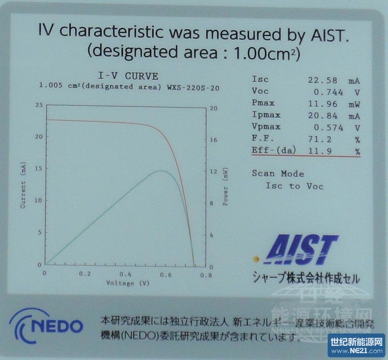实际上,夏普公司采用该色素试制的色素增感型太阳能电池实现了11.9%这一世界最高的转换效率。夏普的试制品的单元面积为1.00cm2,短路电流为22.58mA,开路电压为0.744V,填充因子为71.2%。转换效率由日本产业技术综合研究所测量。今后,为了进一步提高转换效率,富士胶片将继续进行改良,以便能更多地吸收长波端的光。
