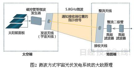 利用微波发生器将太阳能电池的直流电转换成微波之后发送出去,通过整流电路将地面接收的微波重新转换成直流电。发送微波时,从接收端发送指示信号来通知准确的位置。