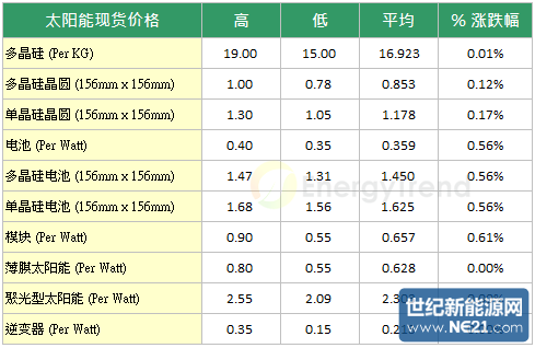 在现货市场方面,由于年假将至,加上年后中国双反政策将会公布,大陆业者的采购系统对于进料的意愿转弱,虽然部分贸易商持续拉抬报价,然与上星期相比,内陆市场价格仍维持在$130RMB至$135RMB之间;在矽晶圆的部分,一线大厂陆续调涨报价,二、三线厂也开始跟进,多晶矽晶圆的市场平均价格上涨至$5.9 RMB/piece左右;单晶矽晶圆的平均价格则在$8.0MB/piece附近,另外电池价格仍持续微幅调整,目前价格落在在$2.5RMB至$3.2RMB之间。美金报价方面,目前多晶矽一线大厂的现货价在$16.5USD/kg至$18USD/kg之间,但出现惜售的现象,二线厂的现货价格较为纷乱,目前平均价格来到$16.923USD/kg,微幅调涨0.01%;在矽晶圆方面,目前多晶矽晶圆最低报价维持在$0.78USD/piece,平均价格则调涨至$0.853USD/piece,涨幅0.12%;单晶矽晶圆方面,目前钻石切割与传统钢线切割的产品报价出现小幅差距,但价格双双走扬,因此平均价格上涨至$1.178USD/piece,涨幅0.17%。另外在电池报价方面,相关业者陆续上调报价并获得不错的成果,使得平均价格上涨到$0.359USD/Watt,涨幅为0.56%,而在模组方面也维持小涨的局面,目前平均价格来到$0.657 USD/Watt,涨幅为0.61%。