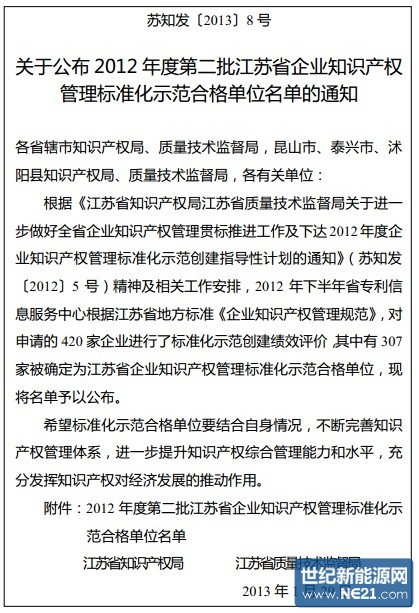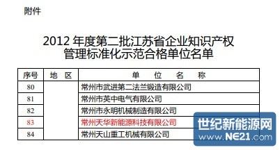 日前,由江苏省知识产权局和江苏省质量技术监督局联合组织的2012年度江苏省企业知识产权管理标准化示范合格单位评选活动结果揭晓,常州天华新能源科技有限公司获此荣誉,标志着公司知识产权管理工作迈上了一个新的台阶。天华新能源自公司创建以来就把知识产权管理置于公司管理的重要地位,将知识产权工作贯穿于企业运行的主要环节,取得了丰硕成果。公司累计申请专利111件,并积极参与起草国家标准、行业标准,知识产权体系逐步完善。今后,天华新能源将以贯标工作为契机,进一步强化知识产权管理,并不断提升企业知识产权创造、保护、运用的能力和水平,加快科技成果产业化进程,支撑公司主营业务的开拓开展,让企业迸发强大的活力。