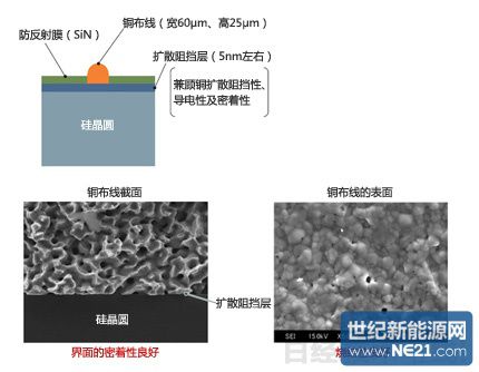 所以将银布线换成铜布线一直备受全球太阳能电池厂商的关注。但该领域存在铜向硅中扩散,导致太阳能电池单元性能变差,以及铜在烧结时氧化,导致电阻值升高等问题。东北大学通过(1)在硅晶圆与铜布线之间形成扩散阻挡层防止铜扩散,(2)改进铜膏的烧结条件防止氧化等措施解决了上述问题。