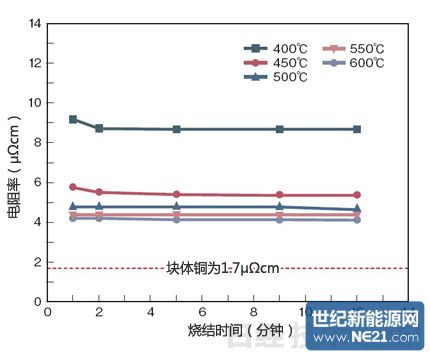 在500℃下烧结1分钟烧结后,铜布线电阻率变为与Ag布线同等或更小的5μΩcm左右。即使延长烧结时间,电阻率也不会上升,因此可在充分防止铜氧化的同时进行烧结(图2)。另外还证实,调整烧结气体的话电阻率还可降至3μΩcm左右。