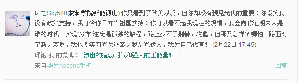 近日,南昌大学太阳能光伏学院的一位学子在微博中为自己代言,让人倍感振奋,也顿觉后生可畏。没有一个产业一直繁荣,也没有一个产业会一直萧条。度过寒冬,光伏还会再度崛起。笔者在这里也不禁要呐喊一句:光伏人,加油!