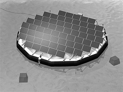 用于太阳能发电的实验室是个浮动圆形岛,直径为25米,安装有100个光伏电池板,以45度的倾角逐一相连。