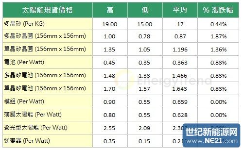 就现货市场表现来看,农历新年假期结束后买气仍然不坠,加上中国双反政策定案出现延迟,业者表示在政策未定之前,价格仍然有上涨的空间,市场走势也呼应业者看法。以大陆市场价格来看,多晶矽平均价格上升至$140.56RMB/kg;矽晶圆的部分,业者陆续调涨报价,多晶矽晶圆的市场平均价格上涨至$6.15RMB/piece左右;单晶矽晶圆的平均价格维持在$8.1MB/piece,但电池价格维持不变。在美金报价方面,目前传出部分大陆业者打算复工,但下游业者表示目前仍以大厂为主要供应商,陆厂产品除一线业者外,主要是作为辅料使用,本周现货价仍在$16.5USD /kg至$18USD/kg之间,平均价格来到$17.0USD/kg,微幅调涨0.44%;矽晶圆方面,主要业者产能接近满载,且高效需求提升有利价格提升,本周平均价格调涨至$0.87USD/piece,涨幅1.87%;单晶矽晶圆方面,需求仍然大于供给,因此涨势仍未平息,本周平均价格上涨至$1.196USD/piece,涨幅1.36%。而在电池方面,厂商仍在拉高价格,加上接单情况佳,情势对业者有利,本周平均价格上涨至$0.363USD/Watt,涨幅为0.83%。