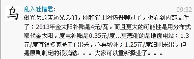近日,微博网友@乱入吐槽君 爆料称,2013年金太阳补贴将下调至4元/瓦,而且金太阳极有可能被分布式所取代,度电补贴可能将定为每度0.35元。