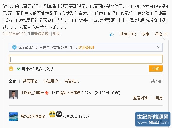 做光伏的苦逼兄弟们,刚和省上阿汤哥聊过了,也看到内部文件了:2013年金太阳补贴是4元/瓦,而且更大的可能性是用分布式取代金太阳,度电补贴是0.35元/度...更悲催的是地面电站:1.3元/度有很多家被T了出去,不再增补;1.25元/度细则未出,但是原则制定的很残酷。。。大家可以重新择业了。。。