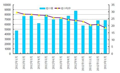 据最新海关统计数据显示,2013年1月我国多晶硅进口量为6791吨,环比微幅增长,同比增加12%;进口单价方面,1月份多晶硅进口均价创历史新低,大幅下挫至18.47美元/千克,环比下降11.58%,同比下降41.5%,较2012年全年均价下滑27.17%。