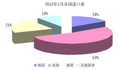 据1月份分国别进口数据显示,韩国、美国和德国是三家最大的进口国家,自韩国、美国、德国进口量占总进口量的89.9%。其中从韩国进口量为1062吨,占总进口量的15.6%;从美国进口量为3627吨,占总进口量的53.4%;德国进口量为1414吨,占总进口量的20.8%;其他地区进口量为688吨,仅占总量的10.1%。
