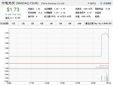周一光伏太阳能个股多数下跌,中电光伏大涨19.31%,收报1.73美元;当日成交量也从日均4.6万股增至16.8万股;不过奇怪的是其成交都集中在尾盘半个小时内,其涨幅也是在尾盘突然拉高的。