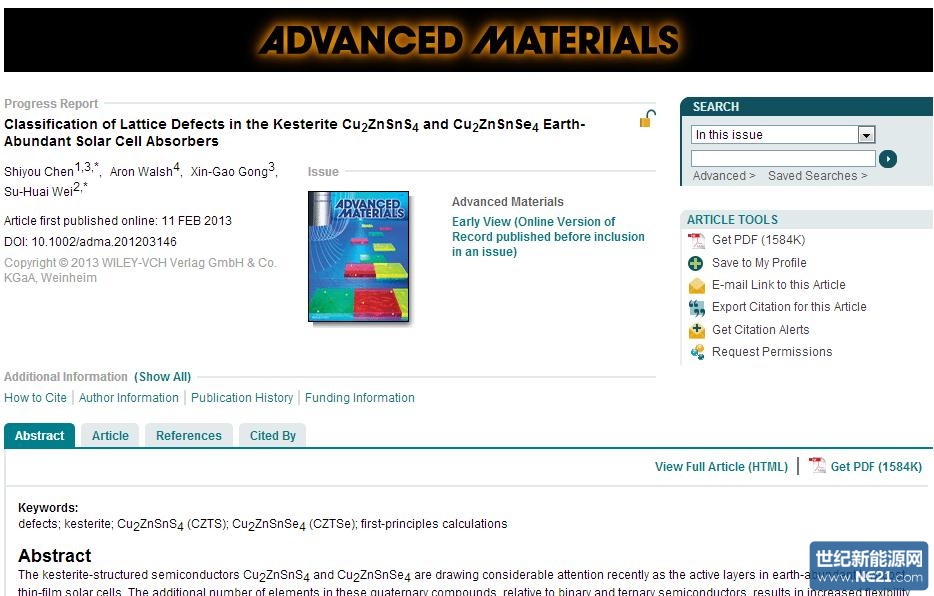 华东师范大学校信息学院化材料与器件教育部重点实验室近期在国际著名材料学期刊《Advanced Materials》(《先进材料》, SCI影响因子13.87,2013年2月11日,DOI:10.1002/adma.201203146)上发表论文,报道了其在多元半导体的光伏转换和缺陷性质研究方面取得的一系列进展。这是首篇以华东师范大学为第一研究单位在《Advanced Materials》上发表的科研论文。