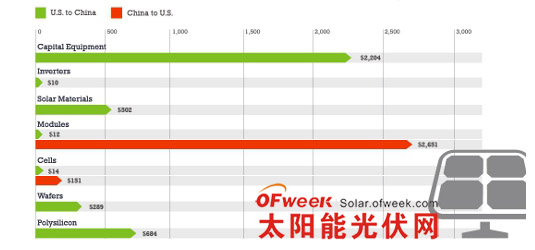 固定设备:用于制造多晶硅和晶元的太阳能固定设备,包括炉子和切割设备,淀积室和涂层机器,机器人以及净化室。“用于太阳能生产进程的固定设备交易是中美两国清洁能源领域贸易组成部分。而所有的贸易都是来自于美国。”报告显示。2011年,从美国出口中国的设备达到了了22亿美金。