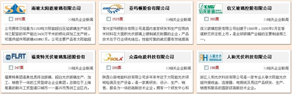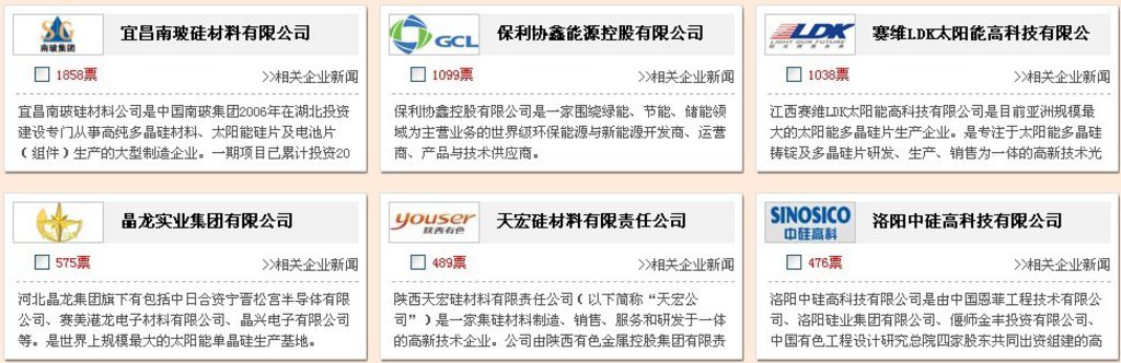 截至3月11日14点,多晶硅企业中仍是宜昌南玻硅材料有限公司雄踞榜首,并以1858票远远领先于第二名的保利协鑫能源控股有限公司(1099票)以及第三名的赛维LDK太阳能高科技有限公司(1038票).保利协鑫能源控股有限公司亦一反常态,由3月4日的第四名一跃而至第二名,赛维LDK太阳能高科技有限公司则由3月4日的第二名跌落至第三名,而投票初始的“王者”晶龙实业集团有限公司却以575票屈居第四位。