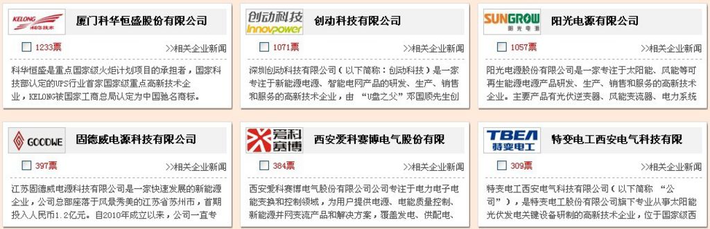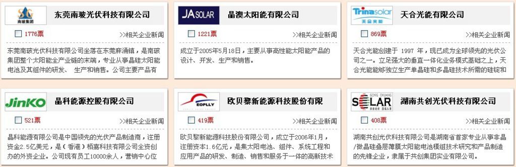 从3月4日对投票情况进行初次总结至今短短7天,电池/组件企业投票却是风云激变。截至3月11日14点,此次投票结果与3月4日大相径庭,东莞南玻光伏科技有限公司以1776票取代了3月4日的榜首晶澳太阳能有限公司、晶澳太阳能有限公司则以1221票屈居第二,紧随其后的是天合光能有限公司(869票)、晶科能源控股有限公司(521票)、欧贝黎新能源科技股份有限(419票),而3月4日排在第三、四、五名的则是湖南共创光伏科技有限公司、天合光能有限公司、阿特斯阳光电力科技有限公司。
