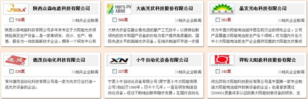 光伏设备企业目前排在前三的分别是陕西众森电能科技有限公司(736票)、大族光伏科技股份有限公司(566票)、德茂自动化科技有限公司(261票),其中3月4日的榜首大族光伏科技股份有限公司屈居在了陕西众森电能科技有限公司之后,而德茂自动化科技有限公司则将三工光电设备制造有限公司挤出了前三。