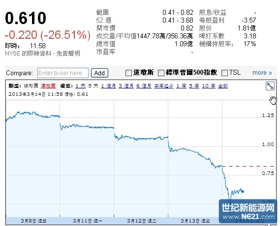 截止记者发稿时,尚德股价报0.61美金。跌幅26.51%