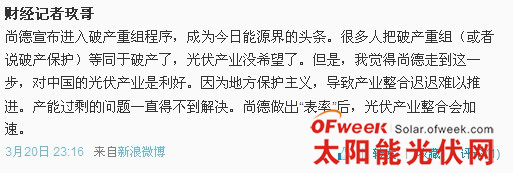 专注新能源、新材料产业报道的“财经记者玖哥”(新浪微博)认为,“很多人把破产重组(或者说破产保护)等同于破产了,光伏产业没希望了。但是,我觉得尚德走到这一步,对中国的光伏产业是利好。因为地方保护主义,导致产业整合迟迟难以推进。产能过剩的问题一直得不到解决。尚德做出“表率”后,光伏产业整合会加速。”