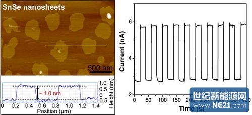 他们利用液相合成方法,发展出一种单步制备出单层、单晶的SnSe纳米薄片的方法。使用二氧化硒为硒源,邻菲罗啉为形貌控制剂,在溶剂和还原剂油胺存在下,高产率的得到厚度只有 ~ 1 nm的SnSe单晶纳米片。实验发现邻菲罗啉的存在对制备出超薄纳米片起到关键作用,被认为在反应中能有效附着于SnSe的 (100) 晶面并抑制其进一步生长。对照实验表明,如果没有邻菲罗啉加入,会得到由较厚的片状SnSe组装成的三维的花状结构。鉴于是首次化学湿法制备出高质量的SnSe单层片,他们还进一步考察了其光电响应特性,结果表明其开关比优于之前所报道的数据。相关结果发表在J. Am. Chem. Soc.,2013, 135(4), 1213–1216.