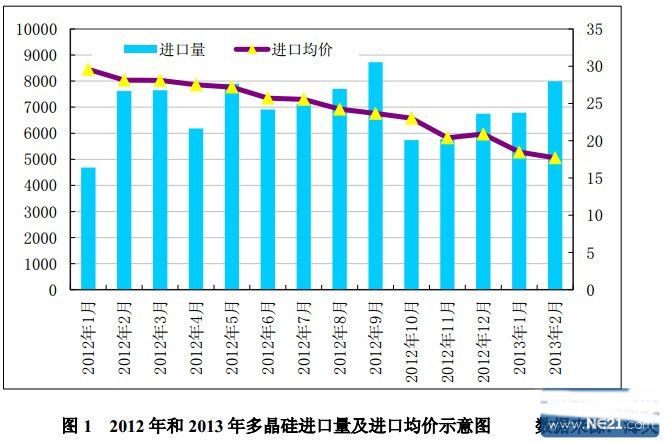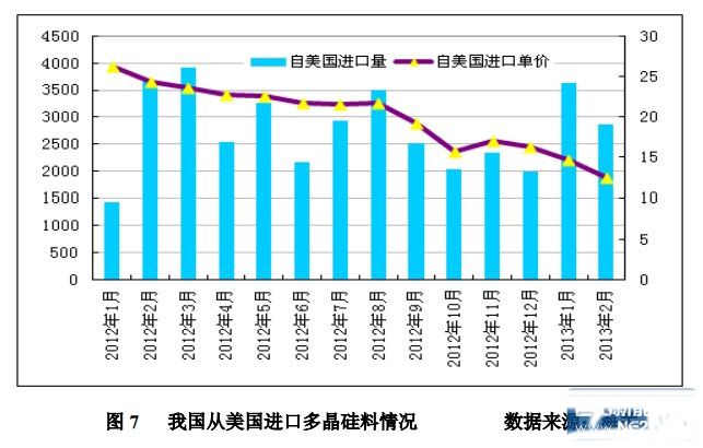 尽管商务部计划多晶硅反倾销初裁在 4 月 5 日前公布,并于2012 年 11 月 26 日启动追溯征税调查,但从 2 月份进口多晶硅量增价跌的形势来看,国外对中国倾销行为并没有得到有效抑制,反而日益猖獗。据最新海关统计数据显示,2013 年 2 月我国多晶硅进口量为 7991 吨,环比增加 17.7%,同比增长 4.9%,同时 2 月份也是自 2011 年以来,除 2012 年 9 月之外单月进口数量最多的月份。进口单价方面,2 月份多晶硅进口均价延续 1 月跌势再创历史新低,大幅下挫至 17.7 美元/千克,环比下降 4.17%,同比下降 37.1%,较 2012 年全年均价下滑 30.2%。