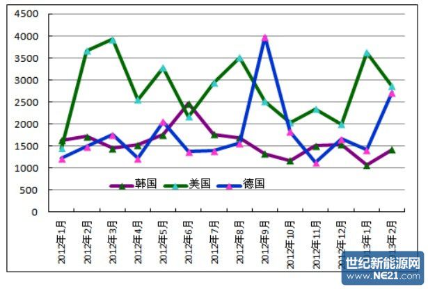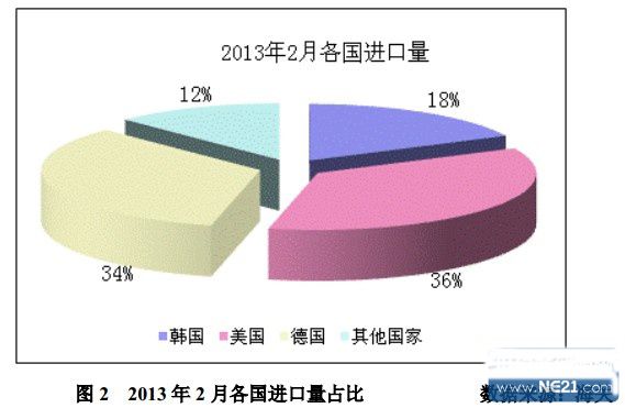 据 2 月份分国别进口数据显示,韩国、美国和德国是三家最大的进口国家,自韩国、美国、德国进口量占总进口量的 87.5%。其中从韩国进口量为 1422 吨,占总进口量的 17.8%;从美国进口量为 2860 吨,占总进口量的 35.8%;德国进口量为2713吨,占总进口量的33.9%;其他地区进口量为996吨,仅占总量的12.5%。从三大进口国进口单价来看:韩国 19.87 美元/千克、美国 12.57 美元/千克、德国 21.6 美元/千克。2013 年 2 月份德国和美国的进口单价较 2013 年 1 月份出现不同程度下滑,分别为 21.6 美元/千克和 12.57 美元/千克,而韩国的进口单价回升到 19.87 美元/千克。