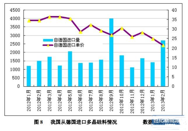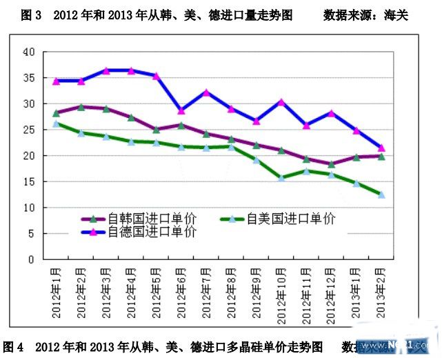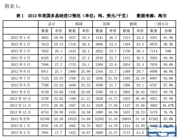 值得业内关注的有两点:第一、2 月份从美国进口多晶硅单价仅为 12.57 美元/千克,低于德国和韩国均价的 37%,且仅为去年同期的一半左右;第二、2月份从德国进口量飙升至 2713 吨,环比增幅为 91.9%,进口价格也下滑至 21.6美元/千克,环比下降 13.6%。无论从美国进口多晶硅价格的迅速下跌,或者从德国进口多晶硅的量升价跌来看,国外倾销意图显而易见。如此低价已远低于多数企业的生产成本,面对低价倾销,国内多晶硅企业恢复生产的希望十分渺茫。