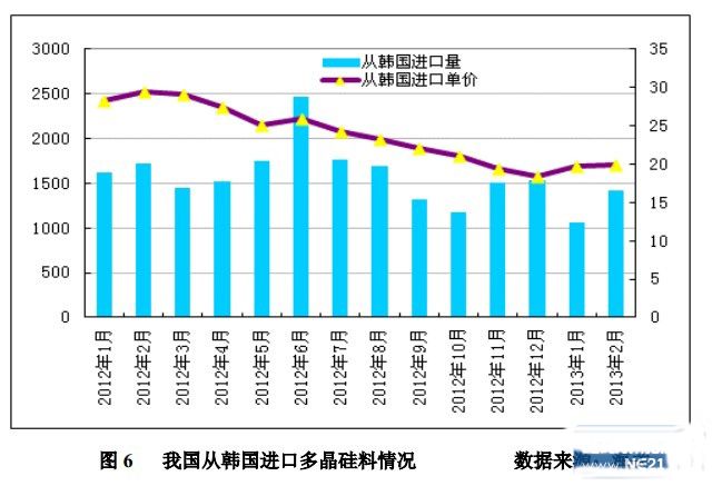 2013 年 2 月份从韩国进口多晶硅量增至 1422 吨,环比上涨 33.9%;进口单价微幅回升至 19.87 美元/千克,环比增幅为 0.4%。2013 年 2 月自韩国进口单价延续 1 月涨势继续缓步回升。