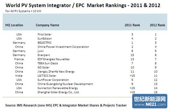 2010年,IMS Research公布的全球光伏系统集成商排名,中国无厂商入围,2011年也仅三家中国企业入围。2012年,太阳能公司与中电投、特变电工、振发新能源、中广核、国电光伏等六家中国企业共同跃进了全球15强,这意味着2012年刚刚转型为光伏电站系统集成企业的太阳能公司抓住了发展机遇,转型初步获得成功。上海太阳能公司将在八院和航天机电的指导和帮助下,以“效率优先”和“效益优先”为工作思路,统一思想,团结一心,不断提升能力建设,不断开拓新的光伏市场,不断挖掘市场潜力,从而更好的推动实现“进入中国光伏系统应用前三甲”的企业愿景目标。