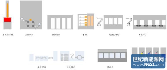 太阳能晶硅电池由多个生产工艺段构成,其中包含了对于运动控制要求较高的切片、机器人、丝网印刷,也包括了流程与工艺控制的单晶硅拉制炉/多晶硅铸锭炉、制绒、扩散、PECVD与烧结单元,如下图: