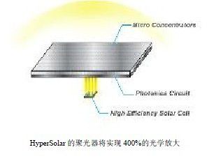 最终的组件大约厚1cm,并能实现400%的光学放大,因此有可能将电池板上所需太阳能电池的数目降低75%,从而大大降低每瓦太阳能发电成本。与目前的聚光光伏解决方案不同的是,这款产品无需笨重的反射镜或透镜,以及复杂的太阳跟踪结构,HyperSolar的聚光器很薄,同时这种平板型自跟踪太阳能聚光器可用于传统平板太阳能电池板系统。聚光器不像其它同类产品那样,只有在占地数十平方公里的项目上才能体现出优势。即使是仅需要几平方英寸太阳能电池板的项目,只需与电池同等面积的HyperSolar聚光器,便可大大降低所需的昂贵太阳能电池数量。