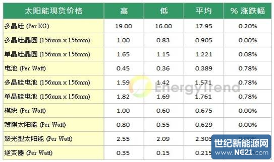 就现货市场整体表现来看,产品走势区域化更加明显。就大陆市场价格来看,多晶硅报价仍在$130 RMB/kg到$150 RMB/kg之间,但目前大陆市场受到政策干扰而出现变量,成交价格持续出现松动,但并未出现大幅滑落的现象;多晶硅晶圆的市场价格维持在$5.8 RMB/piece~$6.2 RMB/Piece之间;单晶硅晶圆的价格则在$7.8 RMB/piece~$8.3 RMB/piece之间,电池方面仍维持平盘。美金报价方面,多晶硅现货价微幅调升,平均价格来到$17.95 USD/kg,涨幅为0.2%;多晶硅晶圆方面,四月价格多数已完成议价,现货市场交易较为清淡,本周平均价格维持不变;单晶硅晶圆本周平均价格上涨至$1.221 USD/piece,涨幅0.08%。电池方面,台湾业者接单情况仍然畅旺,四月报价持续上扬,连带拉动现货市场价格持续走扬,本周平均价格上涨至$0.389 USD/Watt,涨幅为0.78%。模块市场方面,由于日本市场补助金额传出下调10%,目前仍在观察是否影响后续订单状况,因此本周价格仍维持平盘。