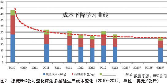 图2显示了REC从2010年第三季度以来的流化床多晶硅生产成本,其中有几个季度REC没有公布生产成本,原因可能是生产状态不稳定,导致成本数据异常,也可能是REC那时还在犹豫中:到底是守着流化床技术自个享用呢还是出卖这个技术以换回一些急需的现金?因为一旦决定这是需要独守的看家本领,对外公布自己的生产成本实在没有必要!