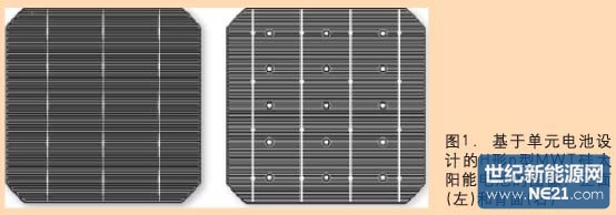 MWT技术较之标准的H形电池技术有以下优点。首先,由于减少了正面金属覆盖而有上面已经提到的电流增益。此外,更重要的是,因为电池是完全背接触,组件内的集成更容易。基于导电粘合剂连接(用于我们的MWT技术)的电池上引起的机械应力小得多,因而减少了破裂。结果,较薄和较大的电池能够互连而没有良率损失。此外,能大大增加封装密度,这有助于得到较高的组件效率。增大到较大电池时,正面金属网格受益于为减少填充因子损失设计的小单元电池图形(见图1)。而且,能易于优化电池互连,使串联电阻损耗低,显著减少从电池到组件的效率损失,这是因为,与常规正面到背面的串焊互连有关的约束(即串焊线宽度的阴影损失和电池上的应力)没有了。对于p型单晶硅,与用串焊机制造的常规H形组件比较,能获得2%的FF相对增益及1%的Jsc相对增益。