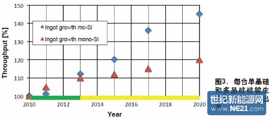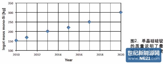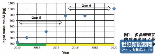 提升多晶硅的生产率主要是依靠改变硅锭的传统结构。图1和2分别是路线图所展示的单晶硅和多晶硅硅锭的质量的增长趋势。